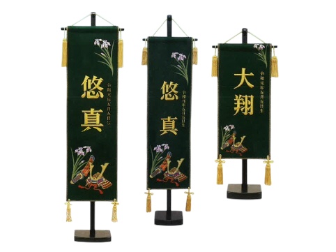 Name flag Embroidered Kabuto with Green Iris Design Size Small Approx. 22 x 15 x 57cm Size Medium Approx. 22 x 15 x 84cm Size Large Approx. 30 x 18 x 107cm